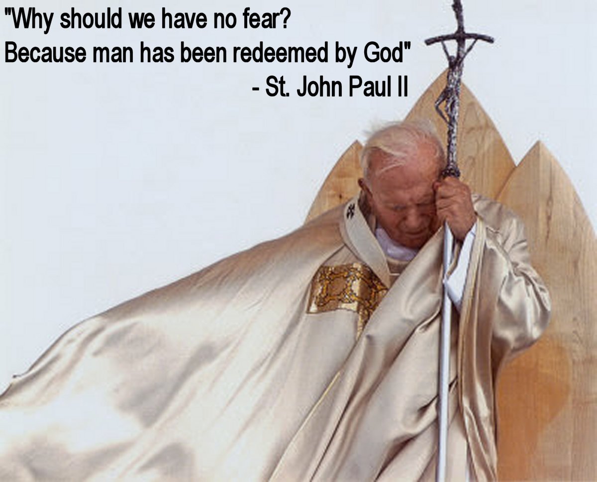 greatest pope with which our modern world has been blest. In his inaugural homily he urged the world to be not afraid: “Brothers and sisters, do not be afraid to welcome Christ and accept his power”; “Do not be afraid. Open wide the doors for Christ”; “Do not be afraid. Christ knows ‘what is in man'”. He reiterated this in his book ‘Crossing The Threshold Of Hope’ where he succinctly tells us why we should not be afraid: “Why should we have no fear? Because man has been redeemed by God”. (Insert retroactive MIC DROP by the Pope here).